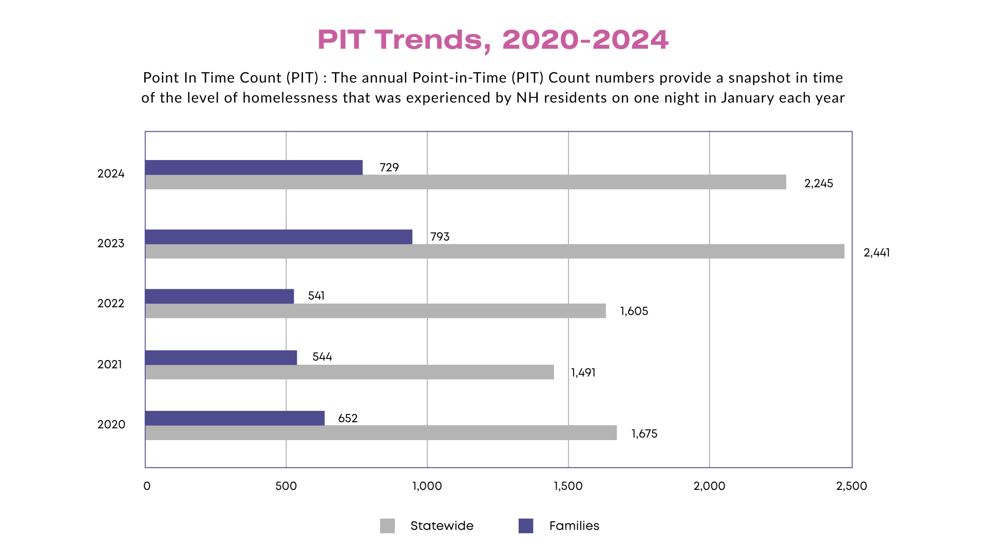 2,406 individuals in NH experienced homelessness in 2025; a 6.7% increase from 2024. Hundreds of families with children don’t have a home to go each night.