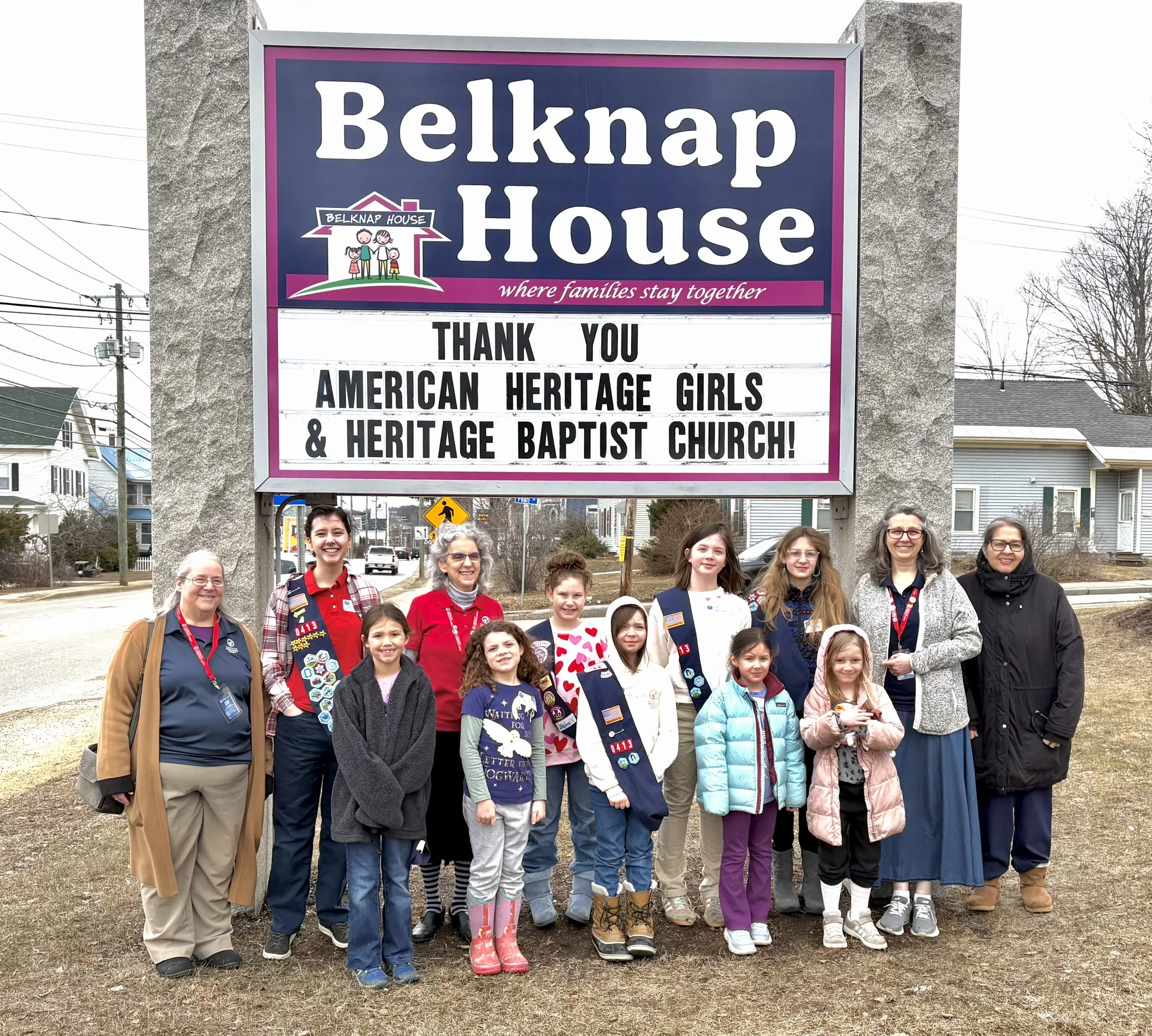 At the beginning of February, the American Heritage Girls - Troop NH0413, and members of the Heritage Baptist Church of Laconia, began collecting items for Belknap House. Their campaign focused on items published on our Wish List. On Saturday, March 21, 2026 Kathleen Kammeraad, the organizer of this event and 12 others, a combination of adults and young people, arrived at Belknap House with an extraordinarily generous donation that included: cleaning supplies, paper towels and toilet paper, 6 new bed pillows, laundry baskets, gift cards to grocery stores and gas stations.