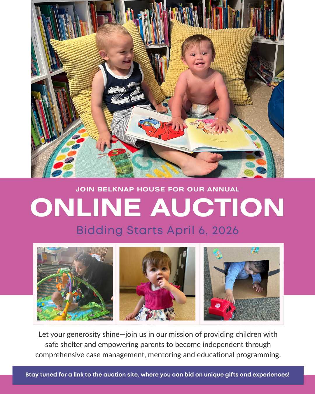 We are excited to be hosting our annual Online Auction Fundraiser from April 6-10, 2026. We anticipate over 100 unique gifts to auction off and the funds raised will go toward continuing our mission of providing children with safe shelter and empowering parents to become independent through comprehensive case management and educational programming. Our mission is to make a positive impact on the lives of families in need, and we are proud of the strides we have made in achieving this goal.