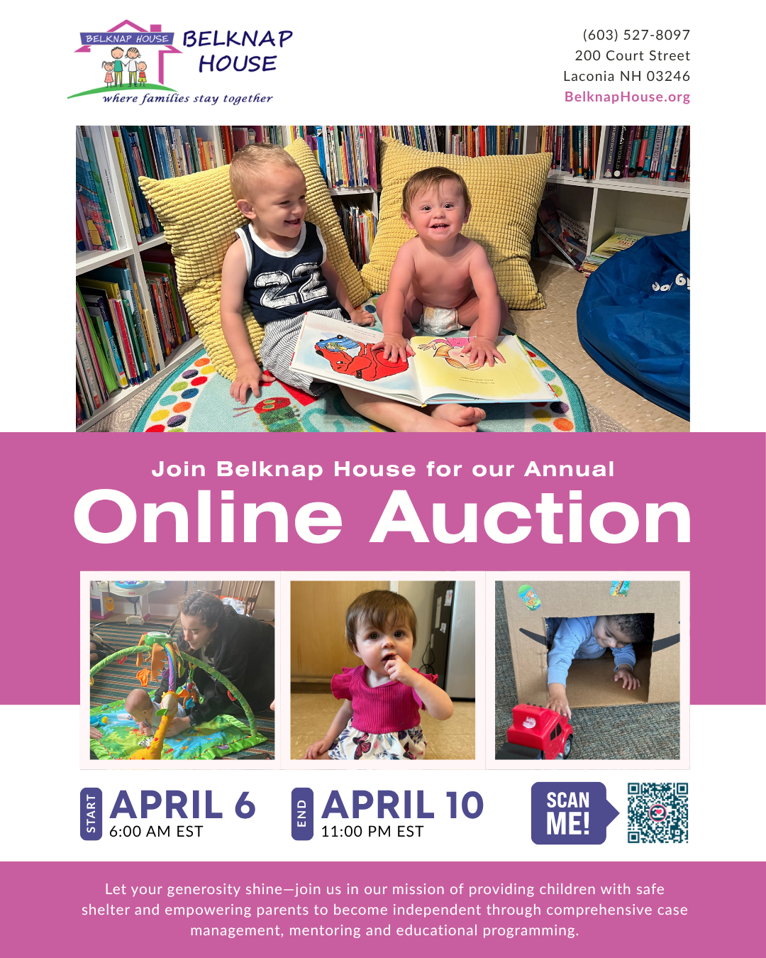 We are excited to be hosting our annual Online Auction Fundraiser from April 6-10, 2026. We anticipate 75 unique gifts to auction off and the funds raised will go toward continuing our mission of providing children with safe shelter and empowering parents to become independent through comprehensive case management and educational programming. Our mission is to make a positive impact on the lives of families in need, and we are proud of the strides we have made in achieving this goal.
